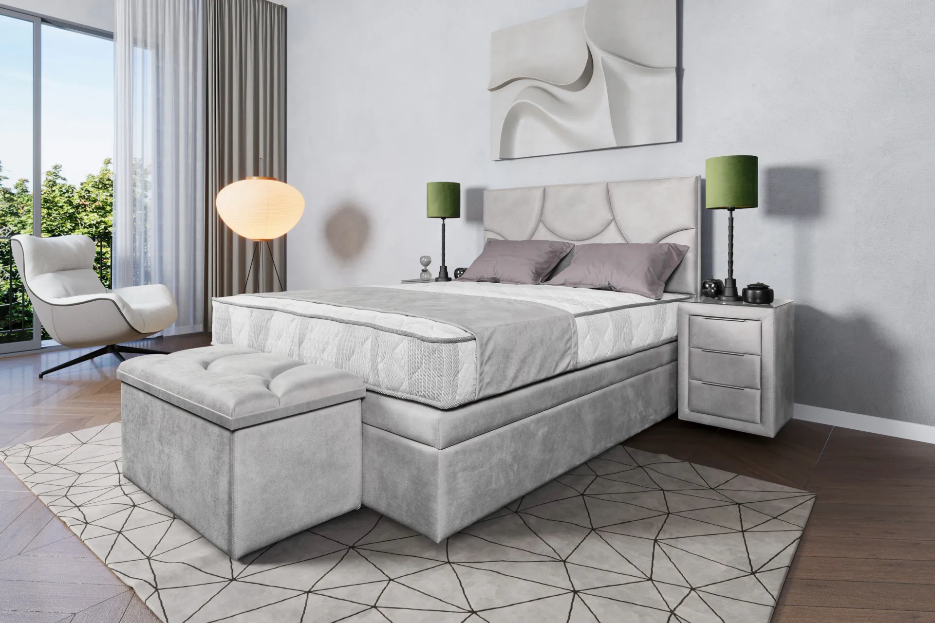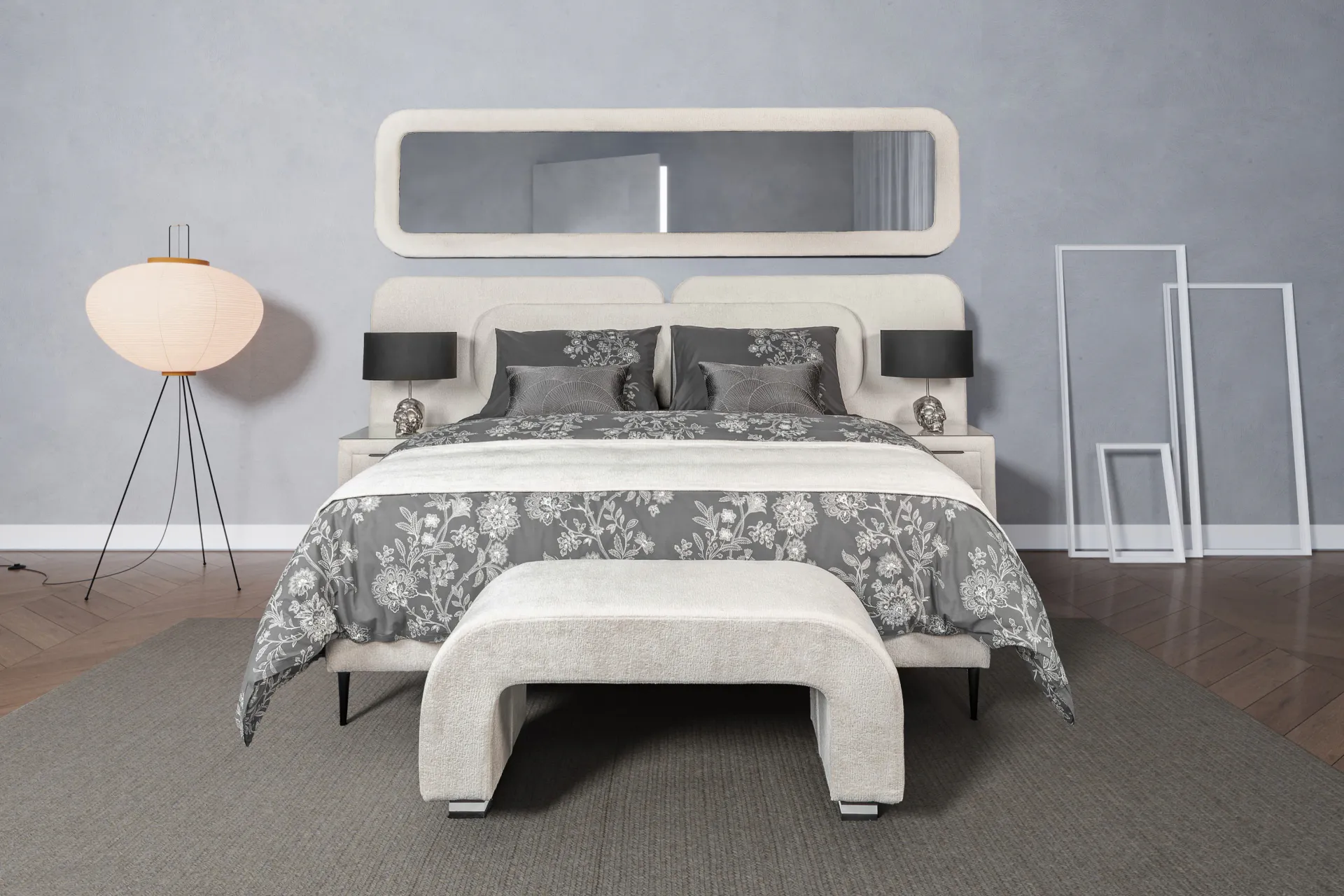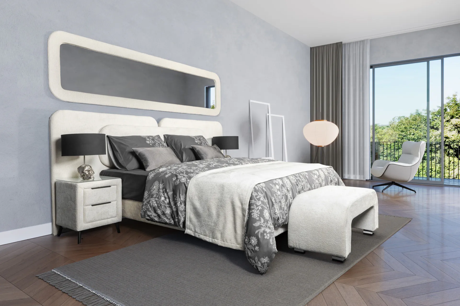 Inspiriran skandinavskim interijerima, Elegance donosi čistoću linija i toplinu bouclé tkanine u vašu spavaću. Svaki detalj — od zaobljenog uzglavlja do brušenih metalnih nogu — govori jezik modernog luksuza.